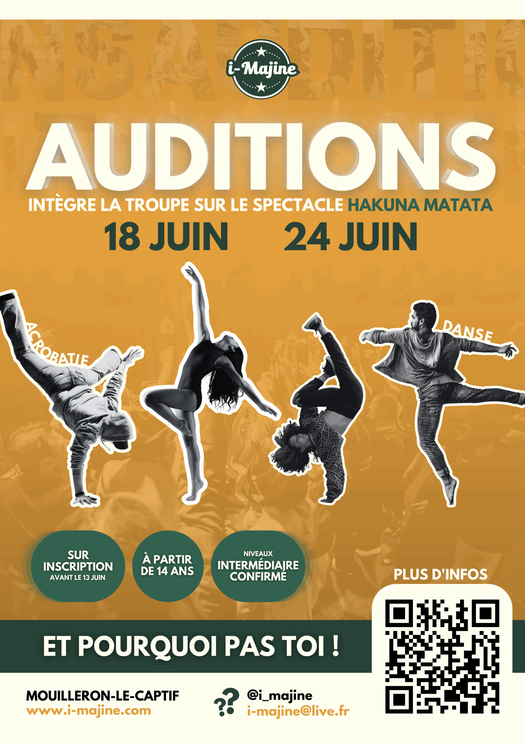Chaque année, la troupe est à la recherche de nouveaux talents pour intégrer les spectacles produits par l’association… Alors cette année, avec le spectacle musical HAKUNA MATATA, i-Majine voit les choses en grand : 8 NOUVEAUX ARTISTES POURRONT REJOINDRE L’ÉQUIPE #HKMT !
